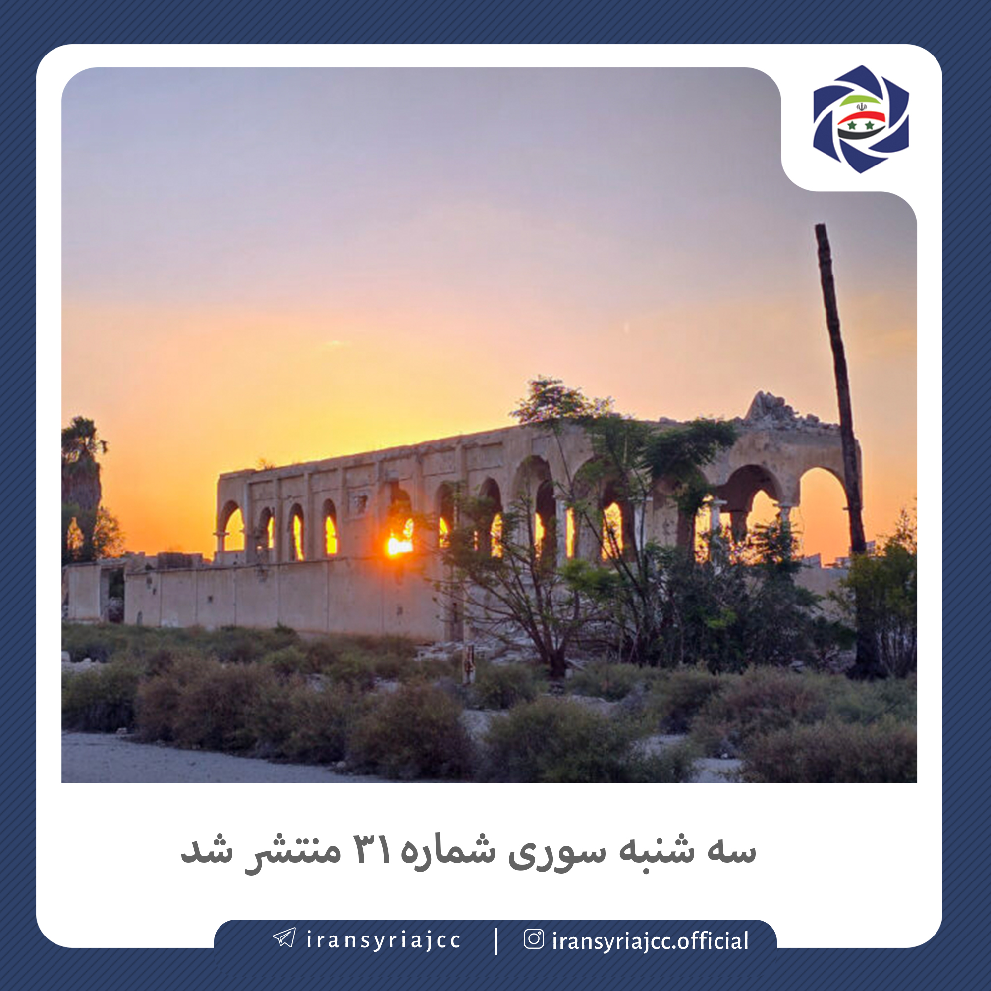 🔻سی‌‌و یکمین نسخه سه شنبه سوری منتشر شد. سه شنبه سوری بولتن خبری اتاق مشترک بازرگانی ایران و سوریه است که به صورت هفتگی با تحلیل اخبار تجاری پیرامون سوریه از نگاه رسانه های انگلیسی، عربی و ترکی می پردازد.
