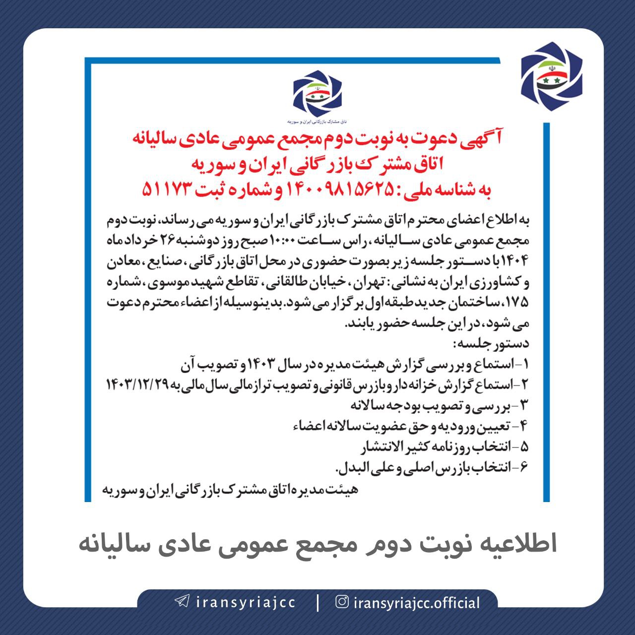 احتراما بدینوسیله به اطلاع کلیه اعضای محترم اتاق مشترک بازرگانی ایران و سوریه می رساند، مقرر است تا مجمع عمومی عادی سالیانه نوبت دوم، راًس ساعت 10:00 صبح روز دوشنبه 29 مردادماه 1403 با دستور جلسه زیر بصورت حضوری در محل اتاق بازرگانی، صنایع، معادن و کشاورزی ایران به نشانی: تهران، خیابان طالقانی ،تقاطع شهید موسوی، شماره 175، ساختمان شماره 1 طبقه هشتم برگزار گردد. لذا از کلیه اعضاء محترم دعوت می شود، در این نشست حضور به هم رسانند.